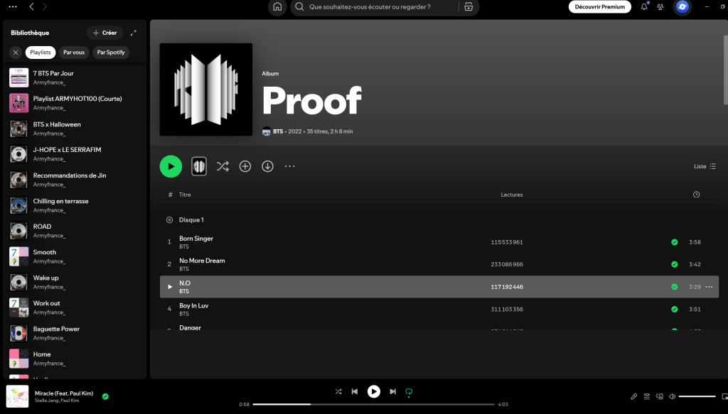 Il n’y a pas de différence majeure entre la version mobile et la version ordinateur de Spotify. Le menu se situe simplement sur la gauche sur ordinateur et non en bas. Sur la version application ordinateur, on peut également voir le nombre de streams des chansons. Ce qui n’est pas possible sur les autres versions de Spotify (navigateur ou téléphone).
