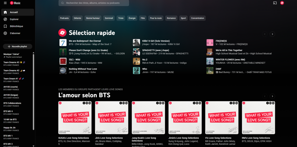 YouTube Music est la plateforme de streaming musical développée par Google. Elle donne accès à des millions de titres, des albums, des playlists, des clips officiels ainsi qu’à des versions live, remix ou reprises.